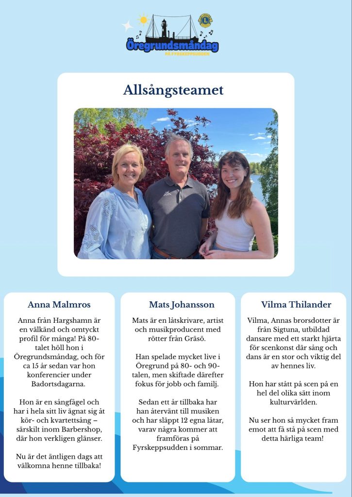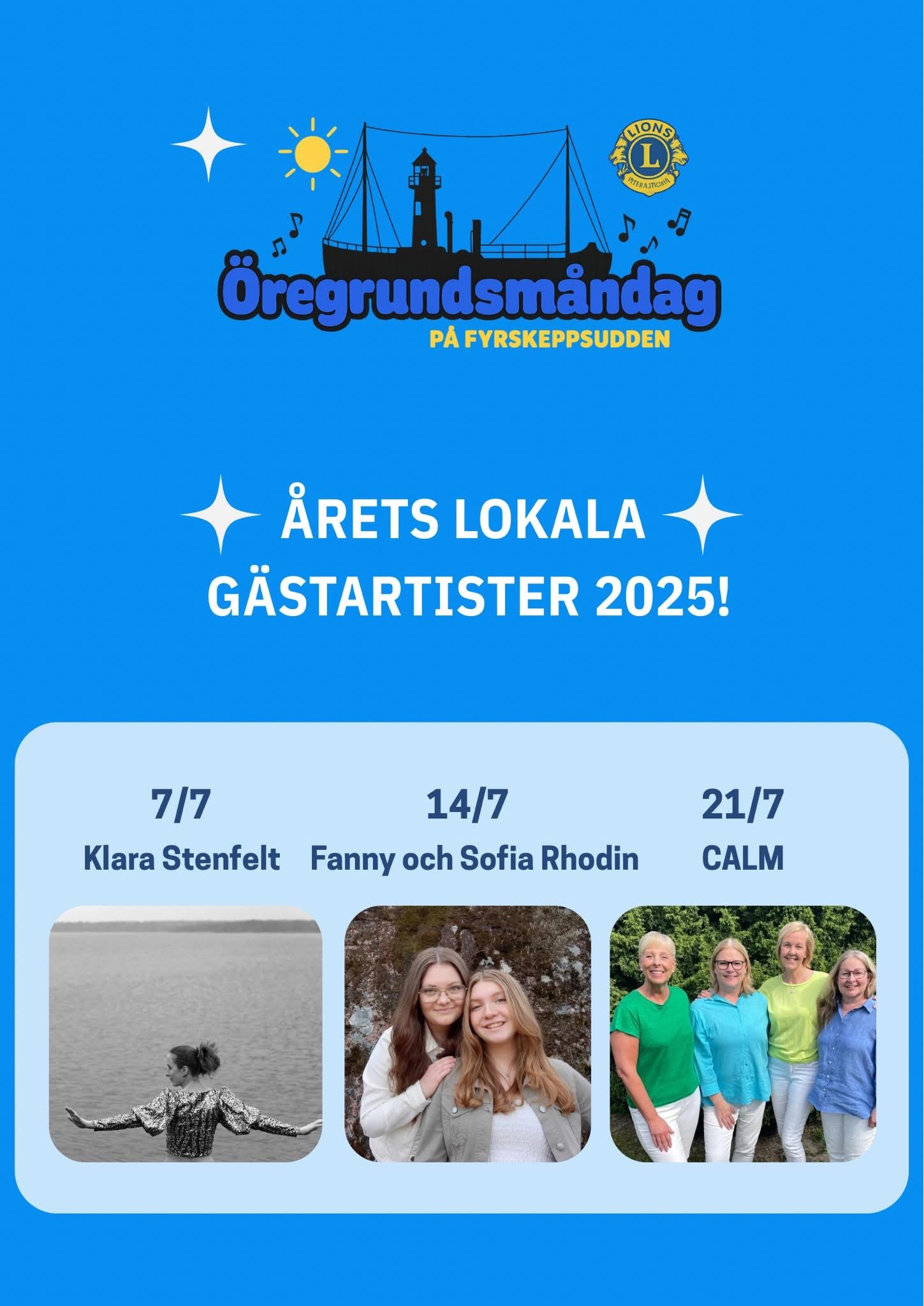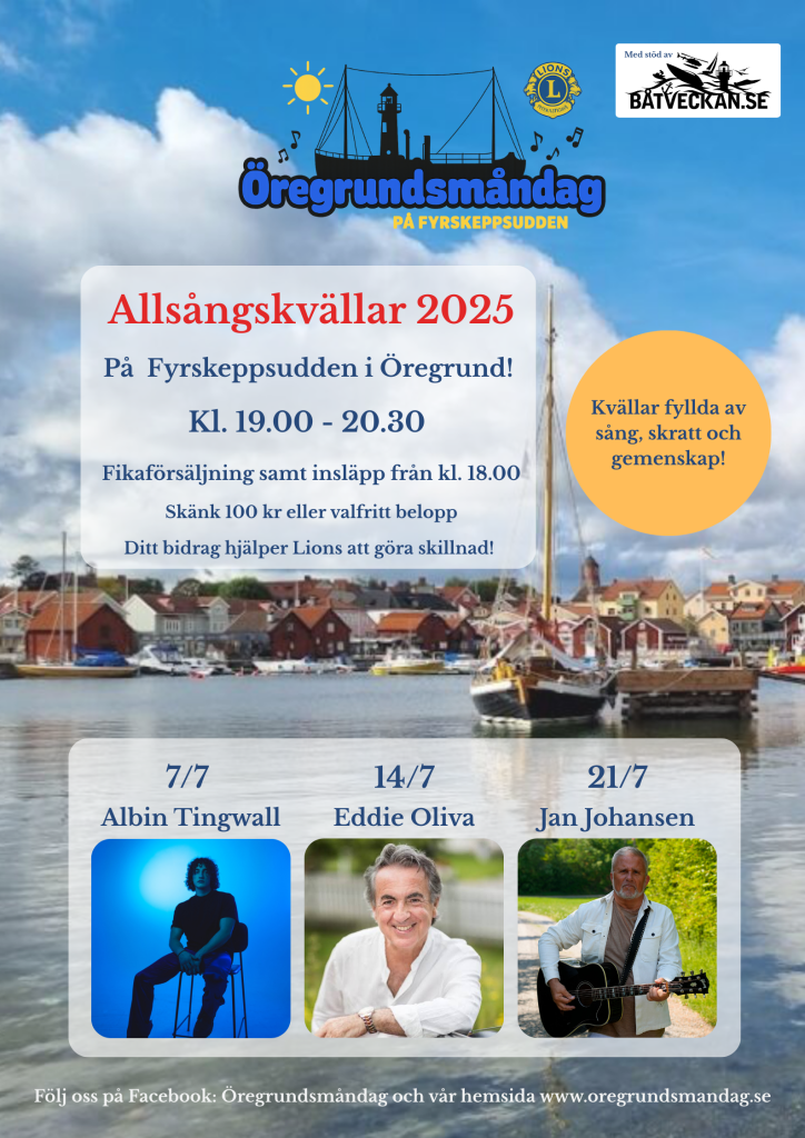 Den 7:e juli kör vi igång från 19.00 med allsång och gästartister. Insläpp från 18.00 med möjlighet att köpa gofika från Lions och godis från Godishuset i Öregrund.